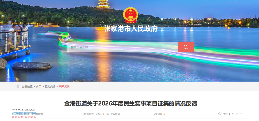 为使民生实事项目更贴近群众需求、符合群众意愿。2025年10月14日,张家港市人民政府金港街道办事处通过张家港市人民政府网站发布《关于征集2026年金港街道民生实事项目的通告》,征集截止为2025年11月14日。目前,征集工作已结束,共收到建议17件次,涉及文化体育、道路设施、养老服务、停车秩序等方面。根据意见征集结果,金港街道将认真梳理,在充分调研论证基础上,将群众关切的事项纳入2026年民生实事项目。